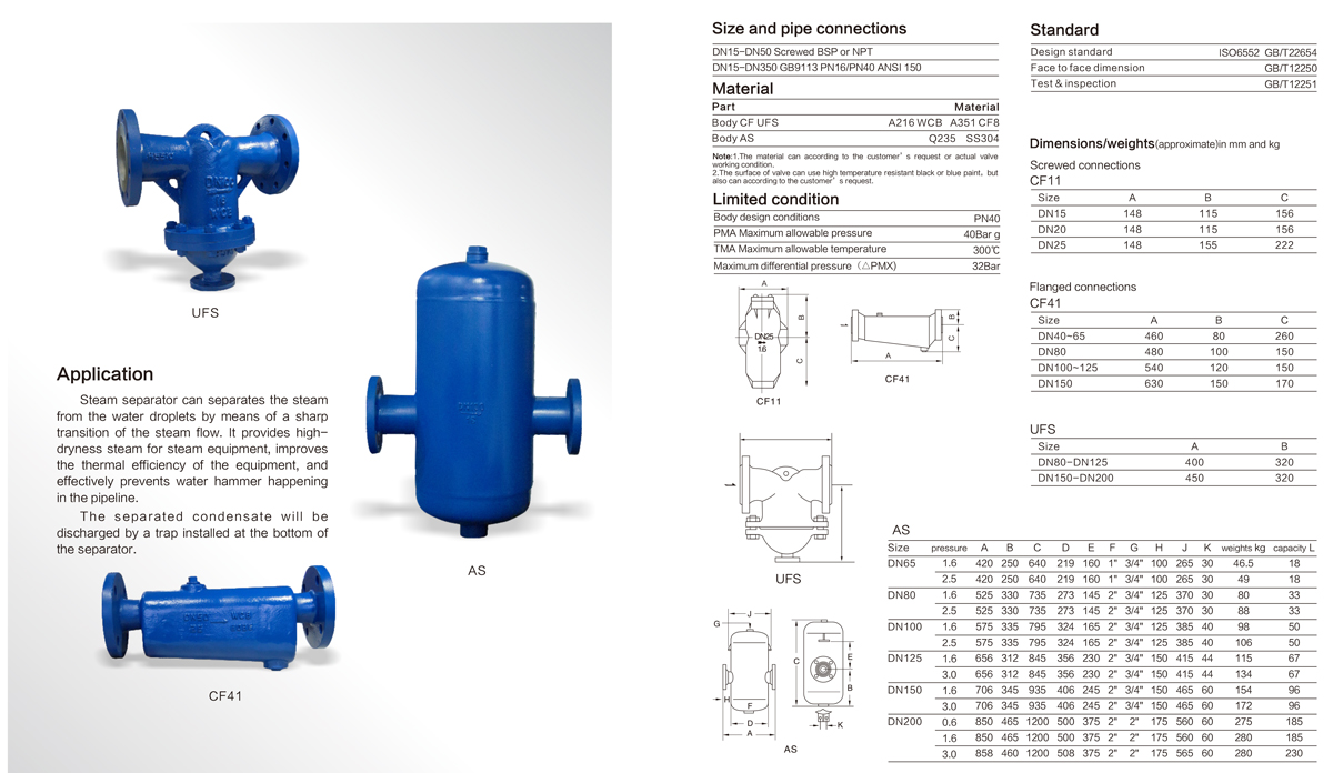 2.分離器應(yīng)安裝在蒸汽管線路較低的位置,前后建議安裝截止閥。