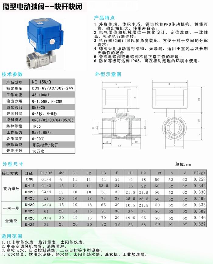 微型電動球閥是萊克公司的超小型電動閥門品種,其執行器和閥體的一體化設計,極大地減小了外形體積,為在儀器儀表及小型設備上的使用提供了方便。閥球、閥桿采用浮動密封結構,既減小了扭力又克服了結垢導致開關不靈的弊病。用戶可選配帶手動和不帶手動的品種,執行器的顏色以及閥體材質、控制方式有多種選擇,額定電壓:DC:5、12V,DC/AC:9-24、110、220V。微型電動球閥廣泛應用于暖通、空調、水處理等各類流體控制設