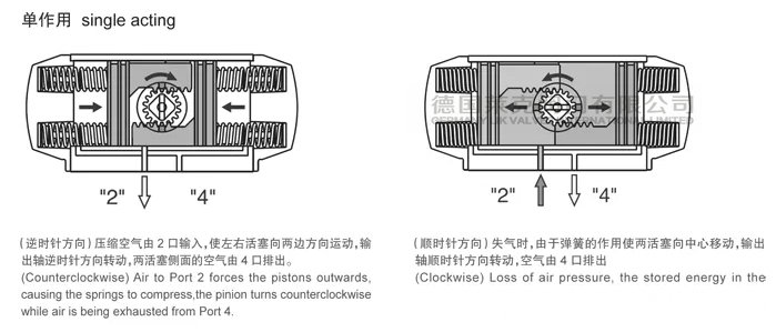 單作用:就是氣缸活塞的一邊是彈簧、一邊是儀表風。——這種閥停儀表風時,活塞就會受彈簧力的驅動而使閥門全關或全開。