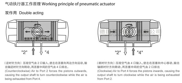 德國萊克雙作用氣動球閥球體是由旋塞閥轉變而來的,它的球心為旋轉90°的動作,球體繞閥體中心線作旋轉來達到開啟,有圓形通孔或通道通過其軸線。當球心旋轉到90°時閥門處于緊閉狀態(tài),當執(zhí)行器工作時,只需很小的轉動力矩就能將閥門關緊嚴密,從而可達到快速截斷切斷的原理。