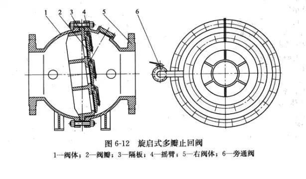 03多瓣式對于大口徑止回閥,如果采用單瓣式結(jié)構(gòu),當(dāng)介質(zhì)反向流動時,必然會產(chǎn)生相當(dāng)大的水力沖擊,甚至造成閥瓣和閥座密封面的損壞,因而采用多瓣式(圖6-12)結(jié)構(gòu)。它的啟閉件是由許多個小直徑的閥瓣組成的,當(dāng)介質(zhì)停止流動或倒流時,這些小閥瓣不會同時關(guān)閉,大大減弱了水力沖擊。由于小直徑的閥瓣本身重量輕,關(guān)閉動作也比較平穩(wěn),閥瓣對閥座的撞擊力較小,不會造成密封面的損壞。多瓣式適用于公稱尺寸DN600以上的止回閥。較大口徑的旋啟式止回閥可帶有旁通閥。